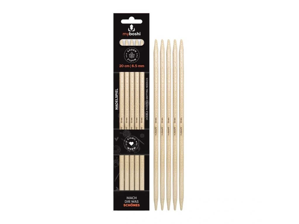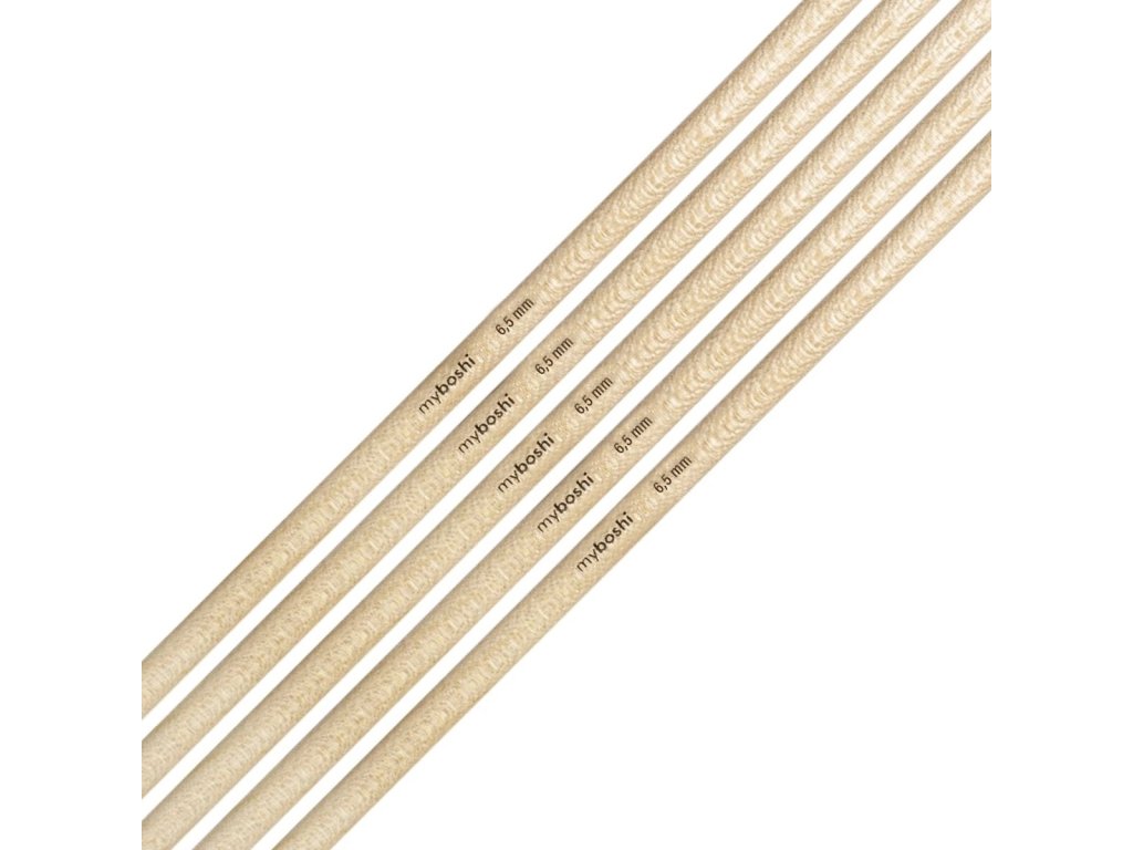 Pletací jehlice myboshi s oboustranným hrotem jsou vyrobené z německého javoru, jsou lehké a teplé, s jemnou strukturou a hladkým povrchem.