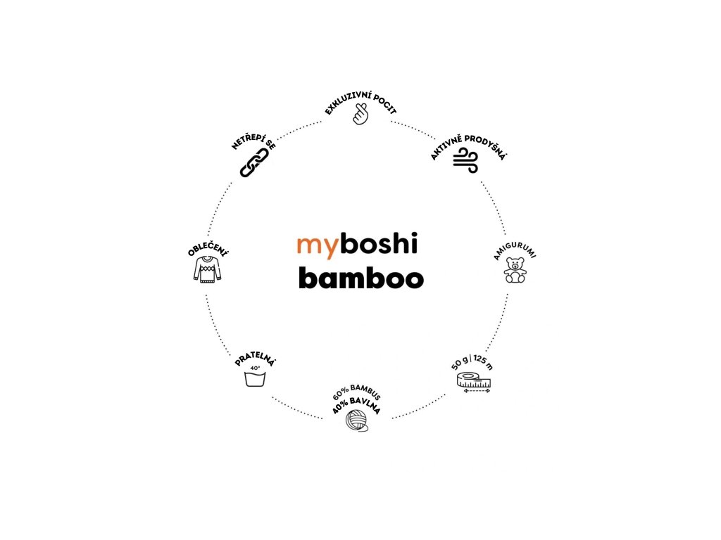 Myboshi bamboo je vysoce kvalitní směs bambusového vlákna a bavlny, kombinuje měkkost s odolností a nabízí nespočet kreativních možností. Příze zaujme svým příjemným pocitem a je obzvláště šetrná k pokožce. Je udržitelná, odolná a prodyšná.
