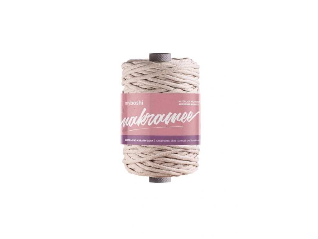 Kroucená příze myboshi Makramee je přírodní produkt prémiové kvality vyrobený ze 100% bavlny. Vyrábí se v Německu a v tloušťce 4mm je na klubku namotaných 50 m šňůry.