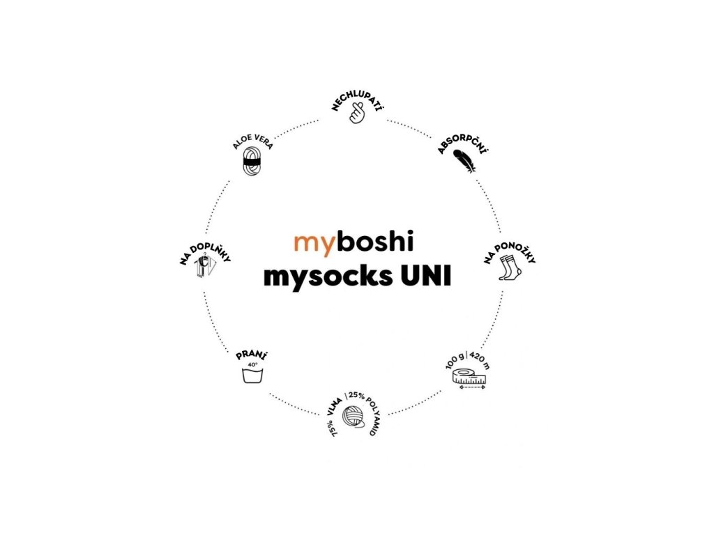4-vláknová ponožková příze myboshi Mysocks je obzvláště odolná a vydrží vše, co ponožka v každodenním životě snese. Její složení zabezpečuje prodyšnost a zároveň měkkost a hladkost.