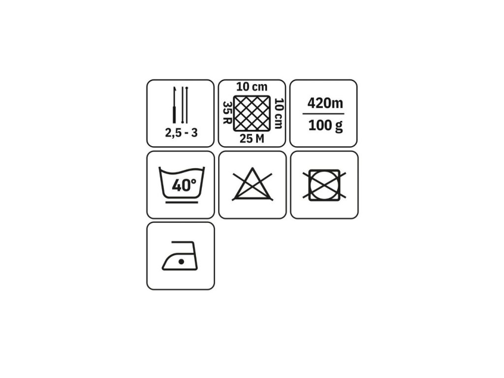 V této přízi jsou čtyři jednotlivé nitě ze 75 % panenské vlny a 25 % polyamidu zkrouceny dohromady, čímž vzniká neplsťovitá, velmi robustní a teplá směs, kterou lze prát až do 40°. Příze má metráž úctyhodných 420 m na klubko a je vhodná pro jehlice o velikosti 2,5-3 mm. 1 klubko by Vám tedy mělo vystačit na pár ponožek až do velikosti 46.