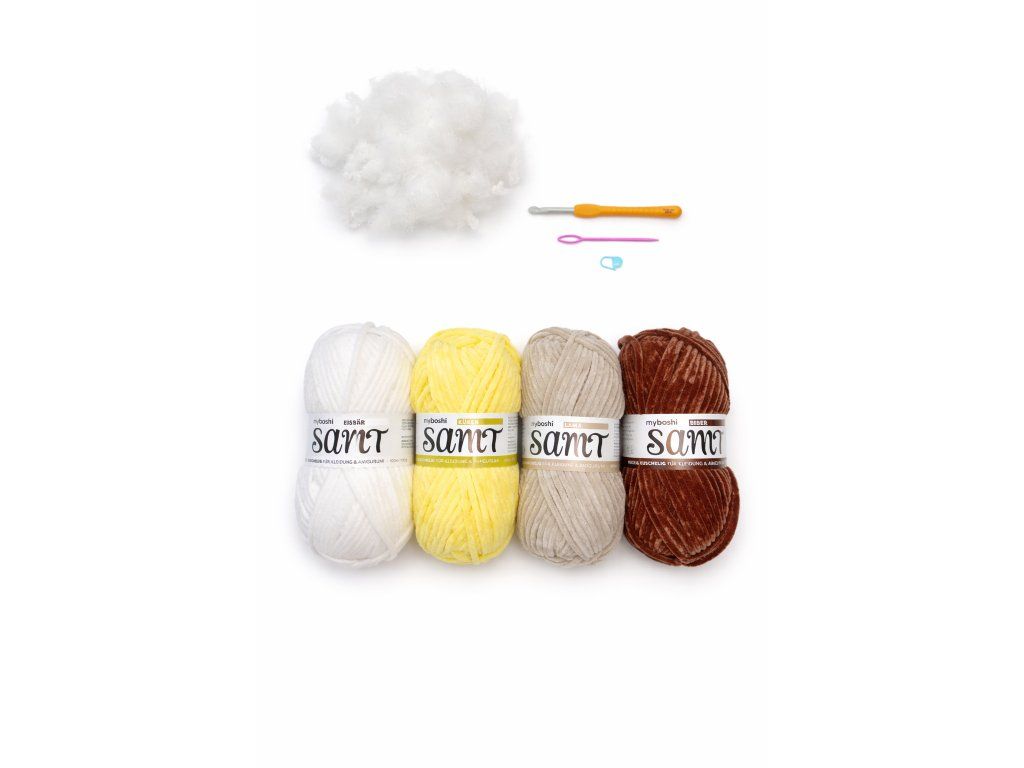 - po 1 klubku příze myboshi SAMT z barev: béžová (slepice), hnědá (hnízdo), krémová (vajíčko) a žlutá (kuřata).